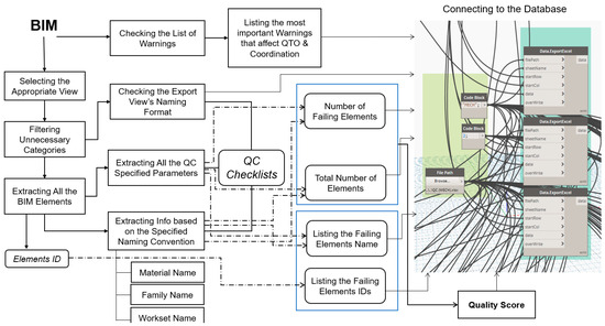 The quality and accuracy of information are essential in any construction project, and low-quality BIM can adversely impact crucial tasks such as QTO, coordination, handover, codification, testing, and commissioning. On the other hand, verifying the quality and accuracy of all of the information and parameters included in BIM models is challenging and time-consuming. Therefore, developing an automated QC system for BIM models is critical in any construction project with specified objectives. This paper introduced an innovative, automated BIM-based QC system, specifically for structural, architectural, and MEP disciplines, to ensure the integrity of BIM models concerning QTO, design coordination, and handover processes in accordance with the project’s QC checklists. A significant contribution of this study was developing an integrated system designed to automate and enhance the quality and consistency checks of BIM models across all engineering disciplines. Utilizing a proposed QC checklist, the system addressed the need for a multi-purpose tool that, while initially project-specific, can be adapted for more generic applications with minor modifications, thereby impacting key project outcomes such as QTO, coordination, naming convention, and BIM model accuracy. At the same time, these are the main limitations found in the previous works. The developed system was also applied to the original BIM models, while most previous research used the IFC format to carry out the QC, which causes some issues such as a loss of information, attributes, and properties [38,39,40,41,42,43].