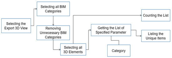Figure 8, Figure 9, Figure 10 and Figure 11 show the algorithms used in automation scripts in the Data Extraction and Analysis Module. Figure 8 shows a part of the automation script to select architectural elements in the BIM model. In this study, after the initial filtering, 7352 architectural elements were selected in the BIM model for the next step in the QC process. Figure 9 shows the algorithm used in the developed architectural QC automation script to check the geometry of room elements in the architectural BIM model. All room elements (59 room objects) were selected in the first step. All related parameters such as “Area”, “Upper Limit”, “Level”, and “Limit Offset” were extracted to check the geometry of room elements as a part of the QC process. This section’s output was to list rooms with geometry-related issues that need to be modified or deleted from the BIM model.