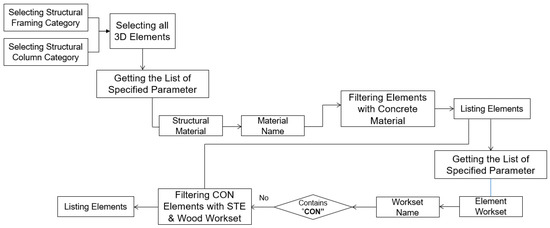 Figure 10 shows the algorithm used in the developed automation script for the structural BIM QC to identify and list structural concrete elements that wrongly have a steel workset. Such misclassifications are not merely nominal but can significantly impact the QTO results, particularly when the workset parameter is employed for classifying quantities. In the case study, this algorithm successfully identified three concrete elements within the BIM model that were mistakenly categorized under the steel workset.