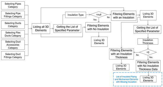 As an essential part of the mechanical BIM model’s QC process, all of the insulated mechanical elements were checked to ensure that they have an insulation thickness value. Figure 11 shows the algorithm utilized in the automation script for the mechanical BIM QC process to identify and list mechanical elements that lack insulation thickness or have it set to zero or null. However, as indicated in the results displayed in Figure 11, all inspected insulated elements in the mechanical BIM model were found to have appropriate insulation thickness values.