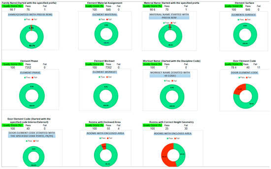 Figure 12 shows the summary statistics section for a specified architectural BIM model. As shown, the model comprised 77 distinct family types, of which 1 was identified as non-compliant with the naming convention standards. Regarding material types, the model incorporated 70 different kinds, all adhering to the naming convention criteria. All of the specified architectural categories’ elements, including the wall, roof, floor, and ceiling (846 elements), had material and area parameter names and values in the model. All of the BIM elements (7352 elements) had “Phase” and “Workset” parameter names. Regarding “Workset” parameters, the model included seven distinct names, all in compliance with the naming convention. There were 51 door elements in the model; 40 of them were coded, and 11 lacked codifications. All 40 door elements, which had a codification in the model, passed in terms of interior and exterior coding parameter values. The model also included 59 room elements, out of which 55 passed the room boundary checks. An additional check was conducted on the height of rooms with closed areas to ensure that they contained space between the ceiling and the top floor where MEP equipment might be located. Of the 55 rooms analyzed for height, 25 met the criteria, while 30 did not.
