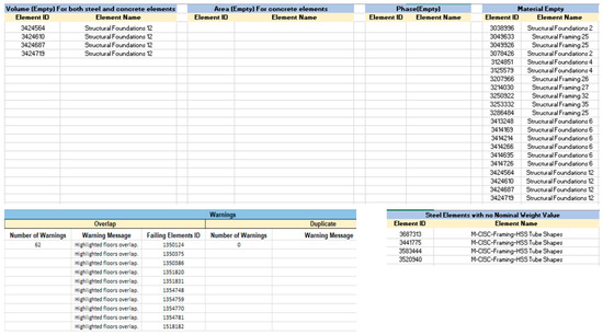 - The system proved beneficial in identifying missing data or information within the BIM models. For example, in the case study STR BIM model, 21 structural elements did not have an assigned structural material parameter value, and 4 steel elements were identified as not having an assigned nominal weight parameter value.