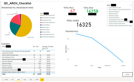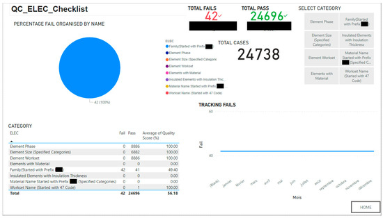 In Figure 15, Figure 16 and Figure 17, the results from the case study’s architectural (ARCH), structural (STR), and electrical (ELEC) BIM models are presented, describing the outcomes based on specific checklists for each discipline. The section consists of different components: Percentage Fail Organized by Name, Category (Name, Quality Score, Sum of Fails, and Sum of Passes), Select Category, and TRACKING FAILS graph. The Percentage Fail Organized by Name component provides a comparative analysis of each QC category’s failure rate relative to the total failure rate. For instance, Figure 15 reveals that within the ARCH checklist, the category “Rooms with Enclosed Area” exhibited the highest failure rate at 58.2%. This was followed by “Door Element Code (started with specified code)” at 22.4%, and “Door Element Code” at 14.9%. Such detailed insights enable engineers to identify which specific cases are lagging in terms of quality based on the number of BIM elements involved. Further, the “Category” table provides additional data, including the quality score and the number of failing and passing elements for each QC category. According to the Category table, categories such as “Element Phase”, “Element Surface”, “Element Workset”, “Family Name”, and “Workset Name” achieved a quality score of 100%, indicating no failures in these areas. Conversely, the “Door Element Code (started with specified code)” category recorded a relatively lower quality score of 50%. Other categories like “Rooms with Enclosed Area”, “Door Element Code”, “Material Name”, and “Element Material” reported quality scores of 53.6%, 75%, 97.6%, and 99.8%, respectively. The “Category” table allows users to focus on specific QC categories and their corresponding results. This feature is particularly useful for engineers requiring a focused analysis of particular aspects of the BIM model. The TRACKING FAILS graph illustrates the month-over-month progression in addressing and correcting failures. This visual representation provides a clear overview of each discipline’s improvements over time.