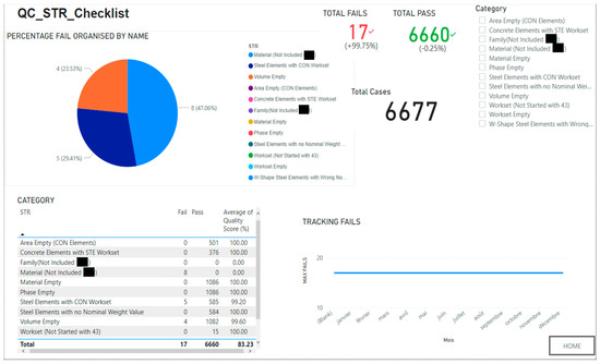 According to Figure 13, four structural foundation elements lacked volume parameter values. Additionally, 21 structural elements were identified as not having assigned structural materials, potentially impacting the model’s integrity. Another notable observation was the absence of nominal weight values for four steel elements, underscoring a gap in the model’s data completeness. Furthermore, the model exhibited 62 instances of “Overlap” warning messages, indicating potential geometric conflicts within the model’s structure. It is important to note that columns in the report displaying “No Value”, such as in “Area for Concrete Elements”, “Phase”, and “Duplicate Warnings”, signified the absence of issues within these specific QC categories in the BIM model. This indicated a level of completeness and accuracy in these aspects of the model. The Excel-based QC report files were uploaded to the ProjectWise platform to enhance communication and foster collaboration among project stakeholders. This integration facilitates a connection with the Data Visualization Module. As previously mentioned, the Data Visualization Module comprises six key components: Home_Checklist, STR, ARCH, ELEC, MECH, and PIP. Figure 14 shows the Home_Checklist section of the module for the case study BIM models. This section provides a comprehensive overview of each discipline, listing the total counts of failed and passed BIM elements. The data presented in the figure reveal that the number of elements failing QC checks in the STR, ARCH, ELEC, MECH, and PIP models are 14, 165, 125, 51, 46, and 109, respectively. This breakdown clearly and concisely represents the QC status across different disciplines within the BIM models.