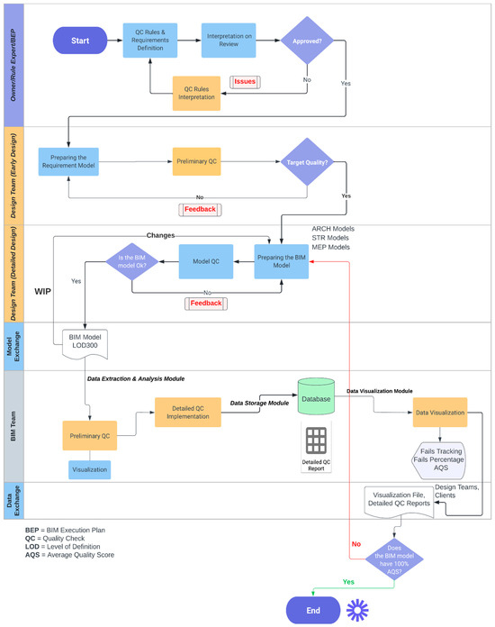 This study introduced a newly developed QC system to check and evaluate the data quality of BIM models. Figure 18 shows the requirement analysis of the developed system. The process begins with experts, who define the QC rules and requirements aligned with the BEP document. It also includes all of the naming convention procedures. Once approved, the design team initiates the preparation of the requirements of the BIM models during the early design stage, followed by the preliminary QC assessment. If the initial quality target is not met, the design BIM model is returned to the design team for revision. Once the preliminary quality target is attained, the design team proceeds to develop the detailed architectural, structural, and MEP BIM models, including all necessary parameters and information as per the QC rules and requirements established initially. Depending on the project’s scale, the QC can be conducted on the detailed BIM models by either the design team or the BIM department. In this study, the BIM department performed the detailed QC on the engineering BIM models, and QC reports were sent to the design teams to correct their models accordingly. When the BIM models are updated weekly in the cloud, a BIM specialist from the BIM department can perform QC processes through visualization and detailed QC implementation using the developed Data Extraction and Analysis Module. The system automatically generates a comprehensive report detailing identified inconsistencies and missing information. The QC report is then transferred to the Data Visualization Module for the design teams and clients to visualize the QC report data, including Fails Tracking, Fails Percentage, and the AQS number. If a BIM model’s AQS number falls below 100%, the detailed report is forwarded to the design team for the necessary corrections to be made to the BIM model. This iteration continues until all BIM models achieve a 100% AQS number. The process needs close collaboration between the design and BIM departments. An appropriate platform like ProjectWise is essential for effective and fast data sharing between the BIM QC coordinator and design coordinator to send the QC reports after each update to the respective design teams to correct their original BIM models accordingly. A BIM specialist performed the developed QC process on the project’s design BIM models. The process execution time varied up to several minutes for each model, depending on the size of the BIM model.