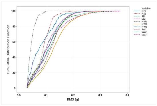 Cumulative distribution function on the RMS acceleration of investigated routes in vertical orientation.
