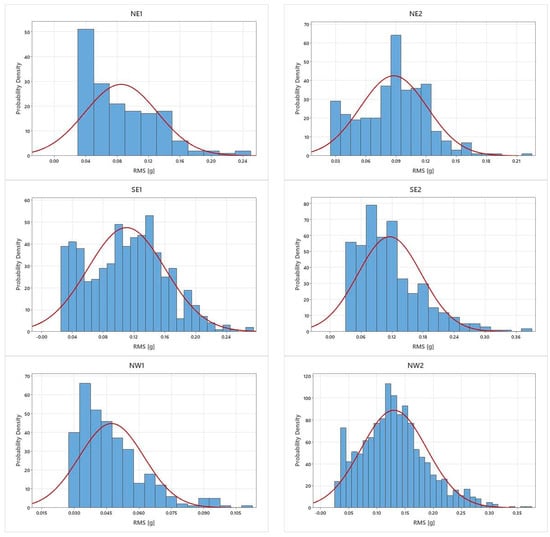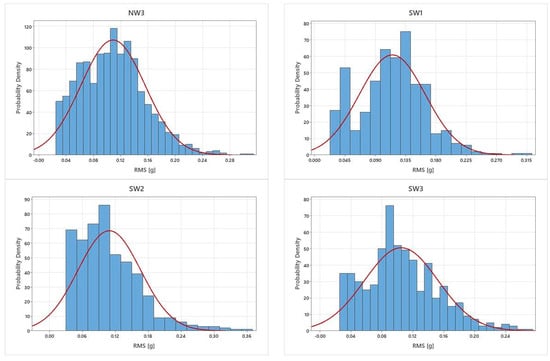 Figure 2 presents the cumulative distribution functions (CDFs) for the rms of measured vertical vibration events. The CDFs shown in Figure 3 provide the probability of event occurrence at a given the rms level. They show that 95% of the rms levels of vertical vibration events from all measured vehicles were below 0.25. The kurtosis (K) and skewness (S) of PDFs shown in Figure 4 are reported in Table 2. Kurtosis indicates how heavy or light the tail of the distribution is compared to normal distribution. The kurtosis of the normal distribution is 0, the heavy-tailed distribution has positive kurtosis, and the light-tailed distribution has negative kurtosis. The data showed positive kurtosis in most cases, except the SE1 route, which had negative kurtosis. These results show that the rms of recorded vertical vibration events do not follow the normal distribution. Skewness provides information on whether the data distribution is symmetrical. The normal distribution has a skewness value of 0, the right-skewed distribution has a positive skewness value, and the left-skewed distribution has a negative skewness value. The skewness value of data in this study ranged between 0.22 and 1.36, indicating that all measurements had right skewed rms data distribution. Most of the routes had moderately (>0.5) or highly skewed distributions (>1.0). The probability density functions (PDFs) with normal distributions for the individual routes are presented in Figure 3. This confirms that the rms of recorded vertical vibration events do not follow the normal distribution, and vehicle vibration is usually not uniformly excited due to irregular road conditions in the field [27].