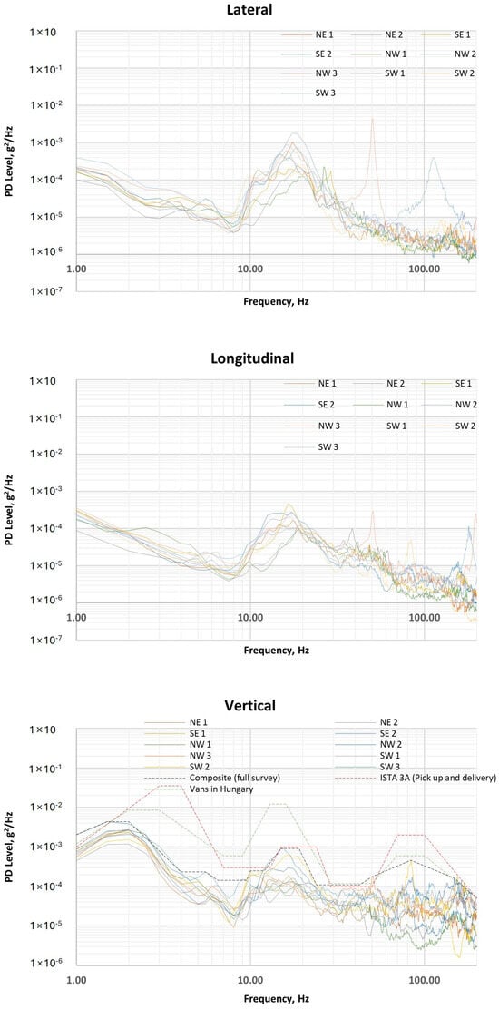 Power spectrum density (PSD) is a way to present the average intensities of vibrations as a function of frequency. In this study, Saver Xware software v.4.2.1.1 (Lansmont Corporation, Monterey, CA, USA) was used to generate PSD for the measured vehicle vibrations. The PSD levels are presented from 1 to 200 Hz. In order to eliminate undesirable events that should not be considered vehicle vibrations, data points under 0.03 Grms (root-mean-square of the acceleration) and equal to or greater than 2 g were excluded from the analysis. This method has been historically used by many previous studies, especially to remove inactive movements of the vehicle, such as idling for pickup and delivery, and shock events that should be treated separately [27,39,40].