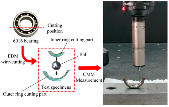 We seleted the design parameters and constructed the input parameter vector . Ten 6016 bearings with the same precision produced by the same manufacturer were selected and cut into 10 groups of specimens by EDM wire cutting, and the dimensional parameter data of the specimens were obtained by measuring with the CMM, as shown in Figure 4, respectively. According to the calculation results of these 10 groups of data, the moments of each size parameter in were obtained. The remaining parameters were obtained according to the method described in reference [41] and are shown in Table 2.