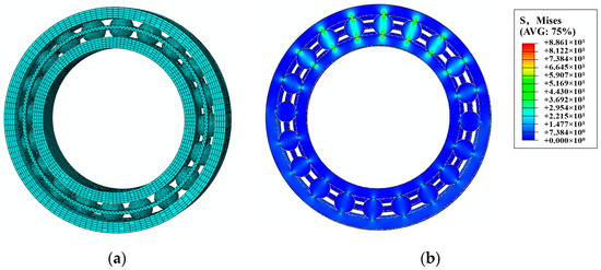 FEM simulation of 6016 bearing; (a) 6016 FEM meshing model and (b) 6016 FEM simulation results.
