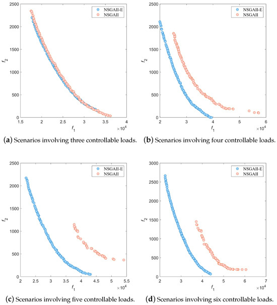 Furthermore, Figure 2 provides a comparison of the Pareto fronts between NSGA-II-MC and the traditional NSGA-II under different scenarios. The optimization objectives in the problems are minimizing operating costs and reducing dependence on the power grid. Each point on the Pareto front represents a management solution, with the horizontal and vertical axes representing the values of the two objective functions. Therefore, points closer to the origin indicate better convergence (optimality) of the algorithm. Multi-objective optimization also considers the diversity of the Pareto front, which involves how well a series of solutions can cover different objective preferences. This is reflected in the distribution of the Pareto front formed by a series of solutions. A more evenly distributed Pareto front that covers a wider range of objective values indicates better diversity. This means that more choices can be provided to decision-makers.