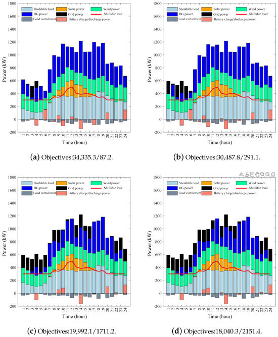 Figure 4 displays the management strategies under different objective preferences with four controllable loads, where (a–d) represent the strategies under various objective preferences. Compared to the scenario with three controllable loads shown in Figure 3, the addition of one more controllable load significantly changes the system’s management mode. During the peak energy demand period of critical and controllable loads from 13:00 to 15:00, the management algorithm designed in this paper tends to ensure energy balance by supplying power through the energy storage system and shedding loads to meet the system’s electricity demand. In the low-grid-dependence mode shown in (a), there is no need for grid power supply during this period, and the electricity demand shortfall is compensated by using diesel generators; in the low-operational cost-mode shown in (d), cost savings are achieved by supplying power through the main grid during this period. Due to the high cost of generation, diesel generators serve as a supplementary energy source at different times to address the issue of insufficient power from the energy storage batteries and renewable energy sources to meet electricity demand.