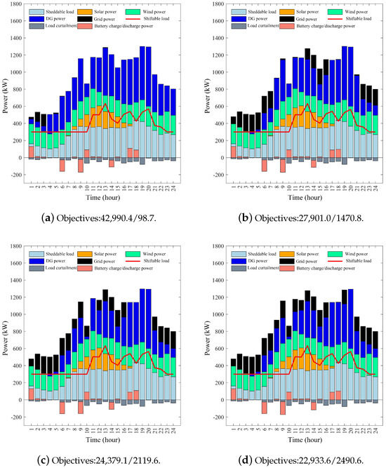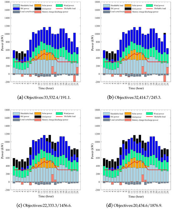 Figure 3 presents the management strategies under different objective preferences with three controllable loads, where (a–d) represent the strategies under various objective preferences. Objective one is the total cost, and objective two is the dependence on the main grid. The management strategy charts display the power generation, load power, charging and discharging states of energy storage batteries, regulation states of controllable loads, and the shedding of switchable loads at different times. Here, the black bar chart represents the power supply from the main grid, the light blue bar chart indicates the power of switchable loads, the light yellow bar chart shows the photovoltaic power generation, the green bar chart depicts the wind power generation, the blue bar chart is for the diesel engine’s power generation, the red line chart represents the regulation power of controllable loads (including critical loads), the grey bar chart shows the power shedding of switchable loads, and the pink bar chart represents the battery’s charging and discharging power. Positive values for the main grid power supply and battery discharging indicate power supply to the system/battery discharge, and negative values indicate selling power to the main grid/battery charging.