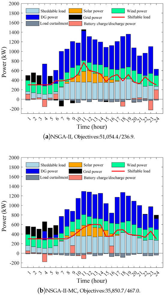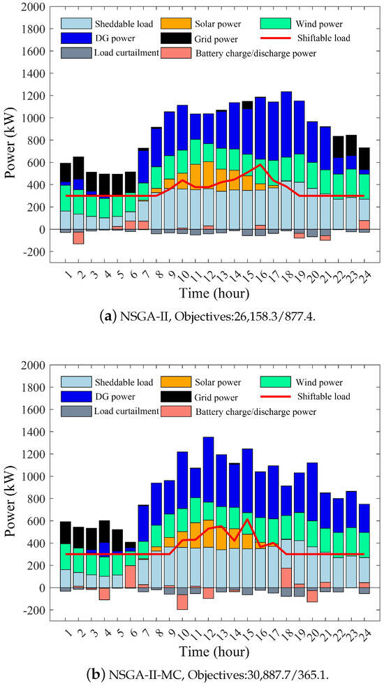 In addition, Figure 7 shows the comparative results of management strategies under four controllable loads scenarios between the NSGA-II-MC and NSGA-II algorithms. This experiment selected the solutions at the bottom of the Pareto front, i.e., the scenarios with the lowest dependency on the main grid. However, it can be seen from the results that the traditional NSGA-II algorithm struggles to meet this preference, still relying heavily on the main grid for power supply, whereas the NSGA-II-MC algorithm tends towards using diesel generators, better satisfying user preferences.
