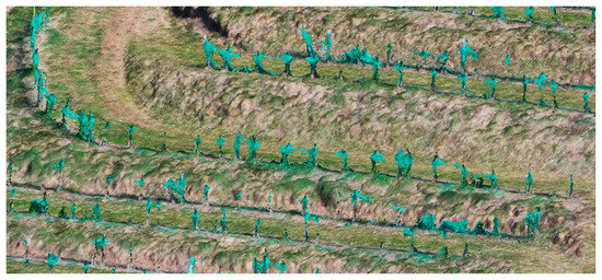 The geolocation of individual vines within a vineyard holds significant importance in the field of viticulture. The spatial data concerning the distribution of individual plants offer valuable assistance during vineyard replanting procedures, enabling viticulturists to establish an accurate inventory of plant count within the vineyard. This information proves instrumental in assessing the current state of the vineyard’s plant population. In this study, the exact location of individual vines was derived by analyzing the 3D point cloud recorded from the mission on 8 April 2023 (Figure 3). At this time of the year, the plants are in the phenological stage EL 1–3, where only leaf tips are visible and the rest of the plant is represented by woody plant parts [18].