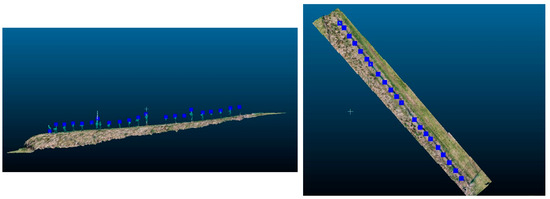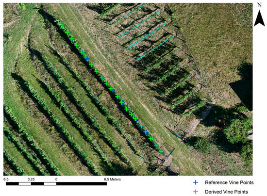 In Figure 11, the reference vine points are visually displayed together with the derived vine points using the 3D point cloud approach, where the maximum z coordinate of the mesh to cloud distance was used to report the respective X and Y coordinates, which resulted in the X, Y, Z location of the top of the vine trunks.