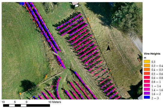 The WDVI aided in distinguishing between non-vegetated objects and vegetation, assisting in the classification algorithm by considering the spectral properties specific to grape vines. The index especially considered that the ratio between NIR and red spectral values on bare soil pixels was consistent and independent of soil moisture. Furthermore, the WDVI (Equations (1) and (2)) was less sensitive to inter-row vegetation in comparison to the normalized difference vegetation index (NDVI). Because of this, UAS-based WDVI imagery could yield a better separation of soil and vine pixels [26]. WDVI values > 0 correlated with vegetation and values < 0 correlate with bare soil or human-made objects [27]. Taken together, the mean nDSM values, the nDSM standard deviation, and the WDVI-values were used to create image objects representing vines. In Figure 6, the calculated vine heights are shown. The image objects representing vines were used to mask the nDSM raster surface, resulting in a vine height raster (Figure 7).