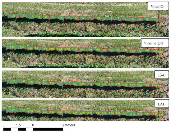 Leaf points were segmented using a 0.5 m threshold, delineating them between the detected trunk locations. Subsequently, a mesh representing the entire canopy of the vineyard row was generated (Figure 9). This process yielded a segmented mesh for each individual vine within the investigated row. The mesh was then employed to determine the LSA. For further analysis, the one-sided leaf area was used. The LSA was therefore divided by a factor of 2. The LSA calculation was automated through the use of Leica Cyclone 3DR Software (Leica Geosystems AG, St. Gallen, Switzerland). The algorithm computed the surface area in square meters for each mesh segment corresponding to every vine in the row and their leaf canopy without grape cluster areas. Those metrics were then used to determine the LAI for every vine along the row under investigation. The LAI is an important metric when characterizing the canopy–atmosphere relation where the energy of the plant is exchanged [28]. By using the estimated LSA per plant and the shape area of the vine segmentation results collected with the OBIA approach, it was possible to calculate the LAI for every vine using the following Equation (3):