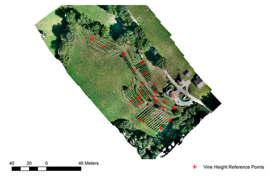 Ground-level measurements were conducted at 23 different points across the vineyard, as shown in Figure 12, to assess the accuracy of the derived vine heights. This evaluation also aimed to gauge the effectiveness of the OBIA approach in segmenting the vine vegetation. Field measurements were specifically taken at locations with active vine growth. In areas without vine growth, the nDSM yielded a value of 0. A vine height reference point registering a value of 0 may signify potential bias in the segmentation process, warranting further scrutiny and refinement.
