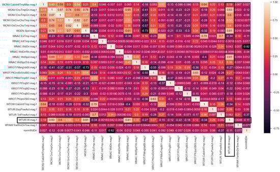 After downloading an initial dataset with 76 features, we have conducted an exploratory data and correlation analysis on one wind turbine (no. 5) to further downsize the dataset of interest. The wind turbine was selected based on domain information that it has active pitch alignment and is considered one of the better performing wind turbines. We were able to decrease the feature set to 24 features, omitting 9 features because of rare changes in values and 43 features because of very high correlation (larger than 0.9) to at least one other feature. The correlation heatmap of the remaining features of interest is shown in Figure 1. Here, we highlighted the row and column for the actual power output (“WTUR.W.mag.f”) which is our target feature of interest to evaluate the power generation performance of a wind turbine. We also added an additional feature to the heatmap which is a calculation of the sinus radius of the wind direction, where the original wind direction values are given in degrees.