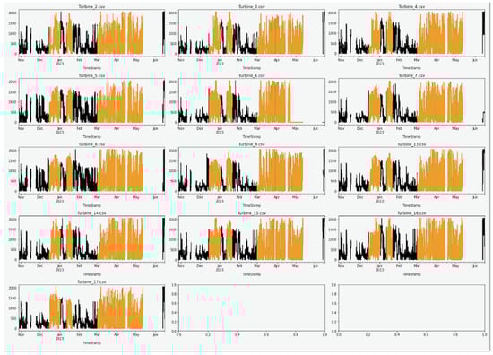 Figure 2 shows the actual power output of the 13 wind turbines over the available time frame from end of October 2022 to early June 2023. The timelines colored in orange are considered “good” based on initial information received from the data provider. We also got informed that the whole wind farm is known to show “bad” performance between mid of November to mid of December 2022 due to dust collection. Furthermore, we can observe in Figure 2 that there are several periods of missing data mostly caused by temporary shutdowns of the SCADA data collection system.
