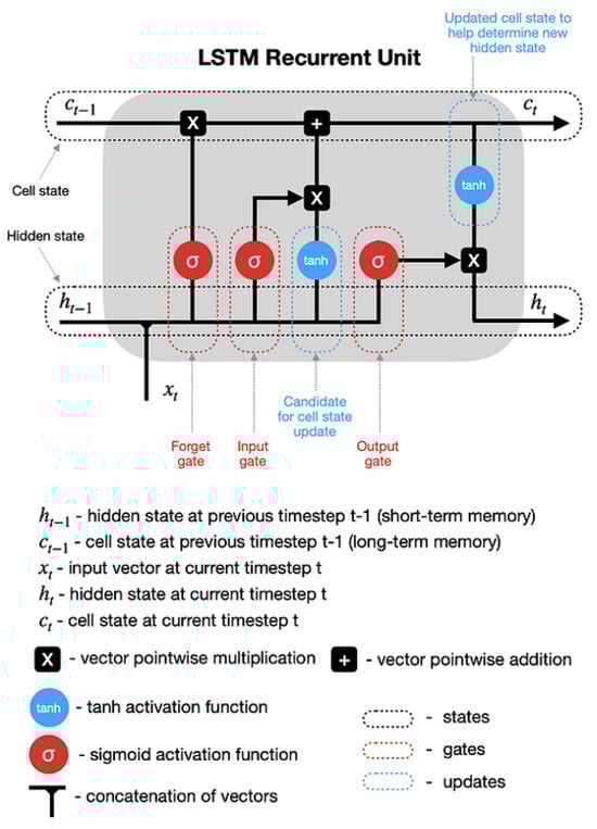 LSTM Cell (https://towardsdatascience.com/lstm-recurrent-neural-networks-how-to-teach-a-network-to-remember-the-past-55e54c2ff22e, accessed on on 15 January 2024).