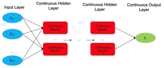 where l indicates the layer number and are the neuron number, , (input time series), (output time series), is a non-linear activation function, is the unknown intercept function, is the bivariate parameter function for the continuous neuron in the hidden layer coming from the continuous neuron of the hidden layer.