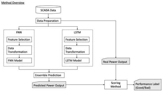 Our expectation is that the prediction model is trained on the good timeline. If the measured prediction errors increase then it means that the wind turbine power output diverges from the expected power output and the wind turbine performance has degraded. We can calculate RMSE and RMSPE cutoff limits based on the validation dataset for the good timeline. With these cutoff limits, we can detect a degradation in performance of the wind turbine from newly arriving data by comparing predicted and true power output values. An overview of the whole proposed method is shown in Figure 5.