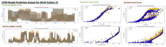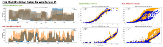 Figure 6 shows the overall flow of our proposed prediction method. In the following, we present the obtained results for prediction and deterioration detection. We have conducted many trial and error studies, where we experimented with LSTM and FNN time series modeling and compared the prediction outputs based on the RMSE. For these studies, we separated the data into “good” and “bad” performing time periods based on domain knowledge obtained from the data provider. A power output prediction model for each wind turbine was trained based on it’s “good” data timeline and then tested on both a subset of “good” and “bad” data timelines.
