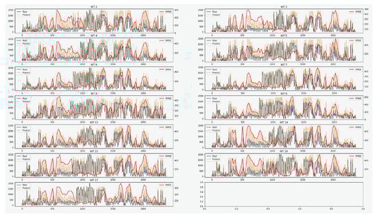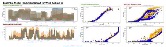 Figure 15 shows the power output prediction results (orange line) in regard to the actual power output (blue line). For overlaps between the actual and the predicted power, the line appears slightly grey. The predicted power outputs are obtained for each wind turbine based on the workflow presented in Figure 6 using the ensemble prediction method. We can observe that the RMSE (red line, scale on secondary y-axis), calculated for 24-h windows, is generally lower in the very beginning and in the middle of the presented test timeline. This observation matches with the time periods that we have identified as “good timelines” based on our domain knowledge.