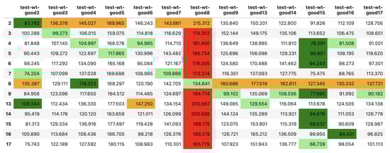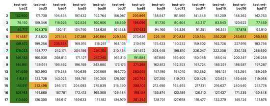 In Figure 13, we can see the ensemble model prediction results (RMSE) for the bad timeline test dataset over all wind turbines. The first column of the table is the wind turbine no. on whose good timeline training dataset the prediction model was built. We used the prediction models for each wind turbine to not only predict the power output for its own test dataset but for all other wind turbines’ “bad timeline” test datasets. Overall, we can observe that each wind turbine is performing worse compared to the “good timeline” test datasets in Figure 12. Also, we can observe that prediction performance results are worst for wind turbine 8 and best for wind turbine 2 regardless of the chosen prediction model. On the other hand, the prediction model for wind turbine no. 3 achieves the overall best prediction performance (light green highlights for the best entry in each column) and wind turbine no. 5 the worst (orange highlights for worst entry in each column).