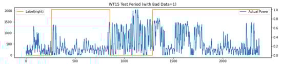 For deterioration detection, we use a continuous time period with good and bad timelines to test the performance of our approach. Figure 14 is showing an example test timeline for wind turbine no. 15 that has good and bad timelines. The bad timelines are labeled by the value 1 indicated by the orange line on the secondary y-axis. All labels were manually assigned according to the available information from the data provider.