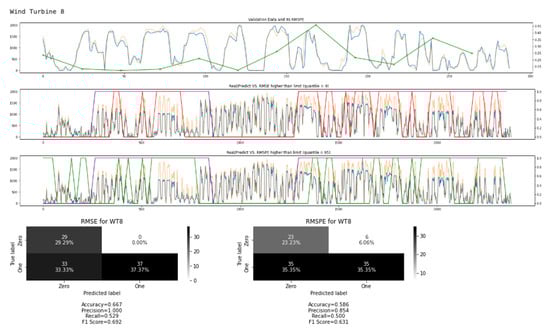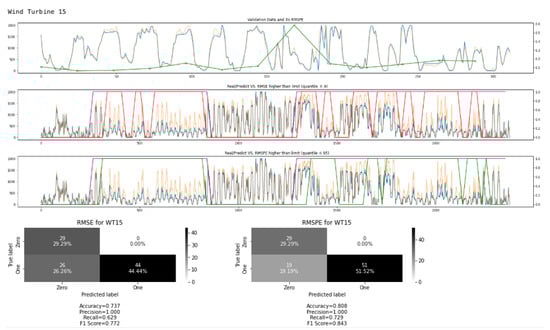 To detect deterioration in the performance of a wind turbine, we want to establish a prediction model performance baseline using RMSE or RMSPE metrics leveraging validation data, i.e., a known good timeline dataset that wasn’t used during model training. This baseline can then be compared to the prediction performance of a test dataset where the real wind turbine output performance is unknown. Figure 16 shows an example of this process for wind turbine no. 15. The first graph shows the validation data and its RMSPE (green line on secondary y-axis). Once RMSPE value is calculated for each 24-h window hence the green line is cut off early in the plot and RMSE can be calculated in the same manner. Then, we use the obtained RMSE/RMSPE values to calculate value cutoff limits using simple statistics. For this research, the cutoff limits are calculated individually for each wind turbine prediction model using the 90% percentile RMSE value and the 95% percentile RMSPE value based on the validation data. Thus, dynamic cutoff limits can be calculated based on the prediction quality for each wind turbine. The cutoff limits are then used to identify if an RMSE/RMSPE value observed for the test data suggests a wind turbine performance deterioration or not. Examples of this can be seen in Figure 16 for wind turbine no. 15, where the second plot shows the RMSE based deterioration labels in red and true labels in purple. The third plot shows similar information for RMSPE with true labels in purple and identified labels in green. The two plots in the last row of Figure 16 show the confusion matrices for RMSE and RMSPE respectively. The plots give us insights into the performance deterioration classification accuracy of the two metrics. Our proposed performance deterioration approach performs better when we use the RMPSE metric. We observe 100% precision, meaning that if the wind turbine is in a good state, we are always able to classify this correctly. There are cases when the method is unable to detect deterioration correctly, especially when the expected power output is in a lower value range or at the beginning/end of a bad performing time period. Performance deterioration might therefore be harder to detect when wind speed and actual power output are low. We conclude that the impact of deterioration is felt more during times where the expected power output is supposed to be high.