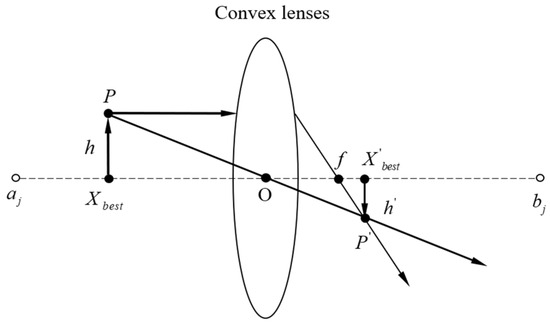 In the search space of the optimization issue, let the position of the global optimal solution be , which is determined by the projection of the individual on the x-axis. The lower bound and the upper bound represent the dimensional value range of the coordinates. The convex lens with focal length f is placed at the coordinate origin . Individual is refracted and imaged by the lens, and the image point with height is obtained. As a result, the opposite point corresponding to the global optimal solution obtained by lens reflection is formed on the x-axis. According to the principle of lens imaging, it can be obtained as follows [28,29],
