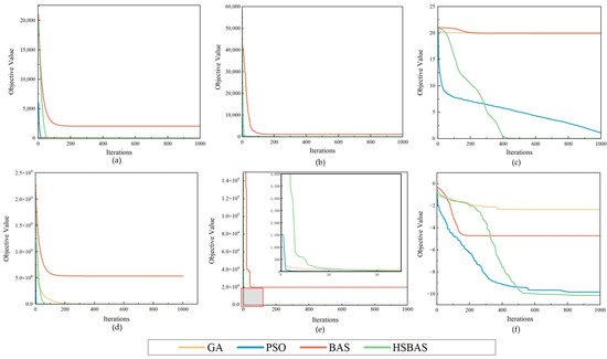 Convergence curves of HSBAS, BAS, PSO, and GA algorithms on representative standard test functions. (a) ; (b) ; (c) ; (d) ; (e) ; (f) .
