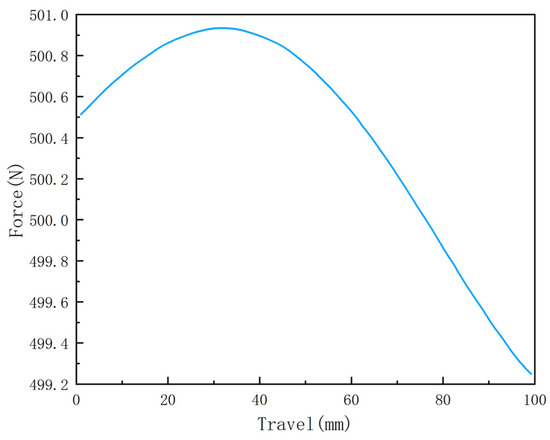After removing the support force the rod requires, the ideal load curve obtained in different strokes of the height compensation module is shown in Figure 7. With the movement of the rod, the load of the load platform shows a slow rise and then a faster decline in the change trend. The change is mainly located in the rang of 499–501 N, and most of the load is located above 500 N, with a maximum load of 500.92 N and a minimum load of 499.23 N. The maximum deviation of the load is 0.92 N, and the degree of deviation is within 0.25%, which meets the design requirements. The maximum load is 500.92 N, and the minimum load is 499.23 N. The maximum deviation of the load is 0.92 N, and the deviation is within 0.25%, which is in line with the design requirements.