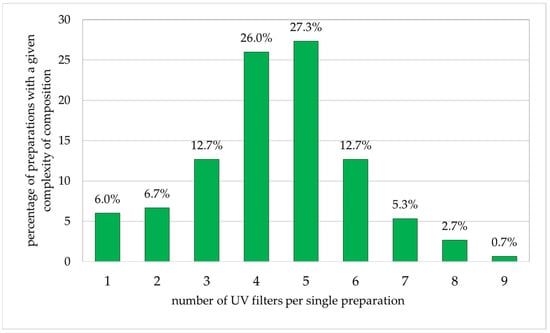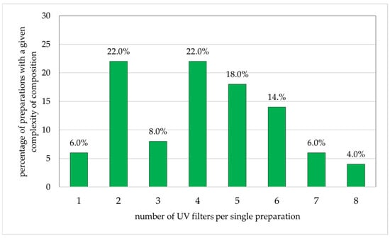 The complexity of composition, i.e., the number of UV filters per single photoprotective formulation, was recorded. For the sake of brevity, ingredients that do not have a photoprotective function were not included in the list.