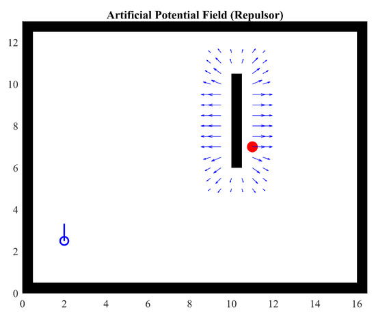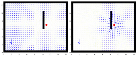 Figure 1 shows a wall in black with a target in red. The agent is represented in blue in the lower left corner. A field is generated by the potential function (Equation (4)) around the wall. This figure illustrates how the repulsive forces generated by the wall can potentially cause a local minimum and make it very challenging for the agent to reach its target. Note that the agent is outside the area of influence of the potential field, that is, the effect of the parameter.