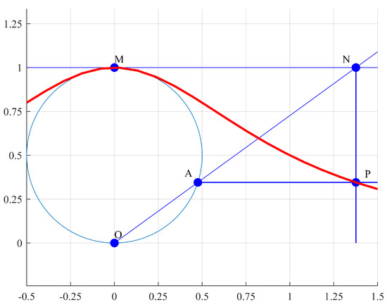 Geometrically, this curve is constructed with any two given points O and M. Diameter defines a circle. Given a point A in the circle, a secant line is drawn and extended up to the tangent line of the circle at point M. If a perpendicular line to that touches point A and a parallel line to through point N are drawn, then the intersection of both lines at point P defines the Agnesi curve. Constant a is the radius of the circle (see Figure 2).