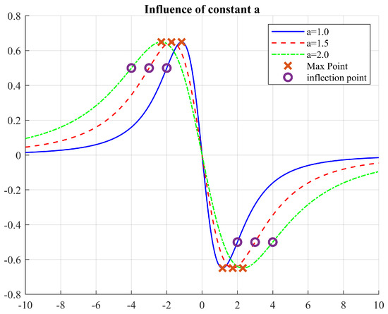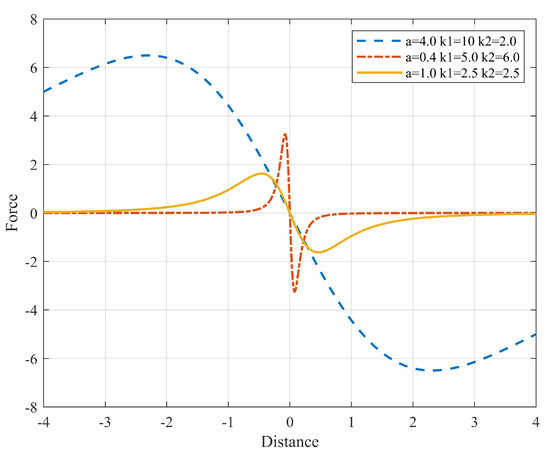 Parameter a will affect the position of the inflection points, but not their magnitude (Figure 5). Similarly, constant will only change the magnitude but not the position of the inflection points. Thus, these two parameters are independent and allow a fine tuning of the field’s scope of influence.