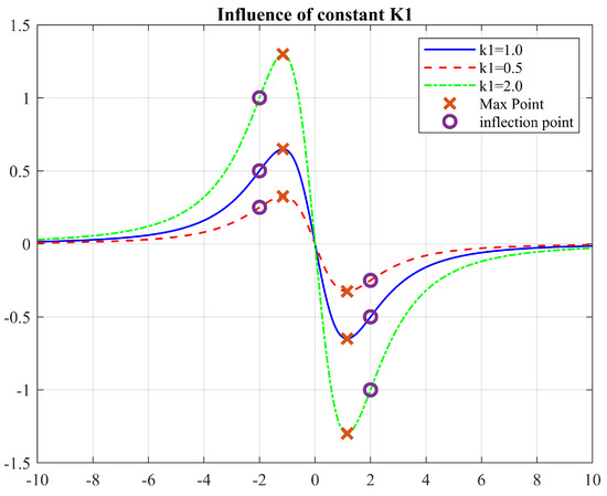 It can be easily observed that there is an inflection point at , as expected. Solving the inner part of (Equation (17)), one can observed the existence of two more inflection points (Equation (18)):