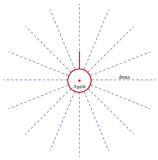 A direct consequence of partial observability is that the agent cannot determine the position of . However, middle points can be determined. Consider an agent with a field of view determined by , where is an angle and is the maximum distance that the agent can see. Let us also consider that the field of view is covered by n sensor beams, in order to emulate a LIDAR sensor (Figure 7). Under the above conditions, four states are defined: