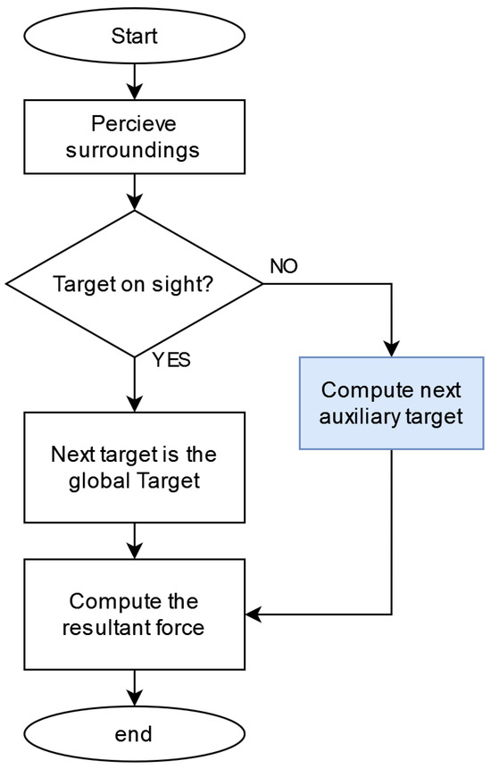The above heuristics will determine where the next local target will be located. Its purpose is to provide a model (see Figure 8) that allow agents to navigate in an unknown environment under partial-observability constraints. Neither heuristics nor Artificial Potential Fields are capable of achieving this by themselves. However, when combined, the resulting model provide interesting capabilities. Notice that there is no path-planning process involved, since only one point ahead (local target) is computed each time.