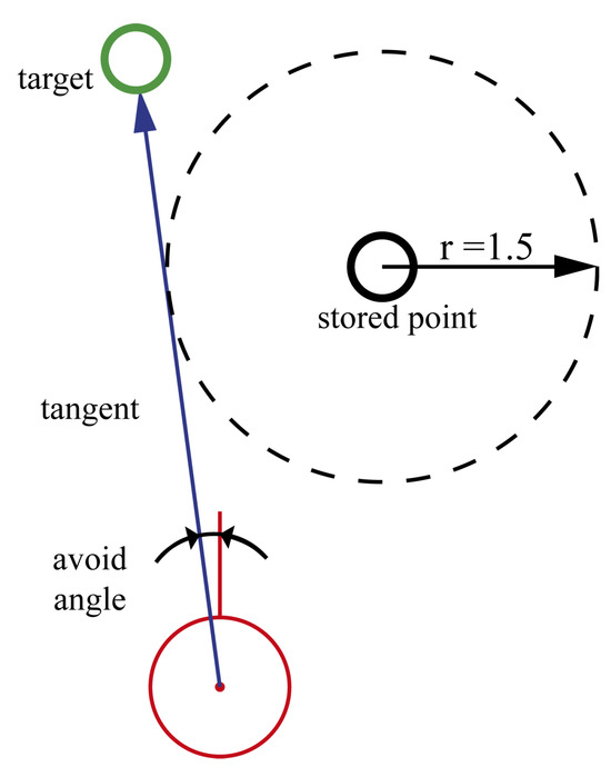 By storing the visited points, an exploration strategy can be implemented to avoid revisiting areas, for instance, by defining a circular zone around the visited points. When the agent is close to those areas, it will try to avoid their computation of the angle of a tangent to that zone (Figure 9). If the agent is too close to maneuver, then the point is ignored. Algorithm 1 shows these calculations. When the angle , the heuristics mentioned above work as described; otherwise, is used to determine the next target point.