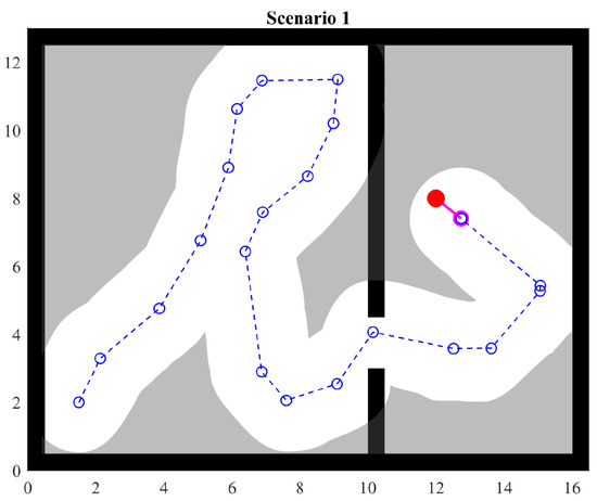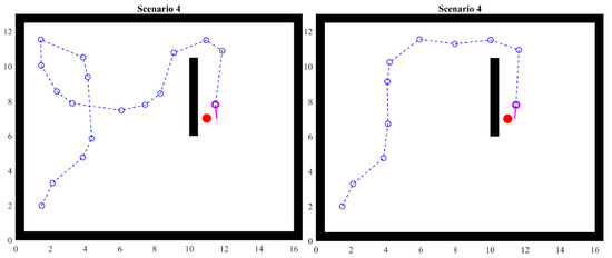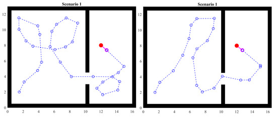 The left side of Figure 12 shows the traveled path with a dotted line. Circles are points visited by the agent. It can be observed that the path forms some loops. This experiment shows that, by storing the visited points, these are considered in the heuristics and avoid generating target points in the same positions, leading the agent effectively through the openings in the walls.