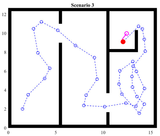 Scenario 2 provides two consecutive gaps between walls but in different positions, hence forcing the agent to search for the second gap. This can be seen as three rooms. In this case, the agent is temporarily enclosed in the second room because it does not have the starting point or the global target in sight. That is, it does not have any reference. In order to move and explore, the agent can only use the aforementioned heuristics and the stored points.