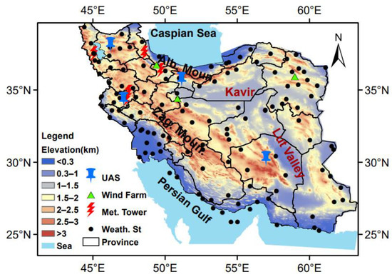The study area and the location of the wind farms, weather stations, meteorological towers (Met. Tower) and upper air stations (UAS) in the Iranian territory.