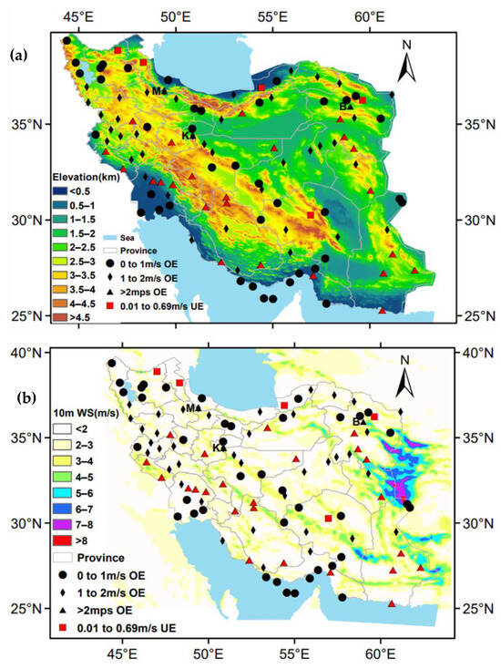 (a) Topographic map of Iran and locations of the stations classified according to the various categories of BE (as in the legend) of annual 10 m wind speed; (b) various categories of BE (as in the legend) and annual mean distribution of the 10 m wind speed (shaded as in the legend) during the period 2004–2020. UE and OE stand for model underestimation and model overestimation, respectively.