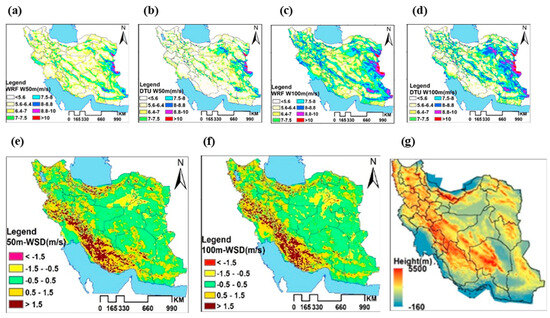Mean wind speeds (m/s) at heights of 50 m and 100 m, as generated by the WRF simulations (a,c) and the DTU wind Atlas (b,d) over Iran, along with their differences at 50 m (e) and 100 m (f). The topographic map of Iran is shown in (g).