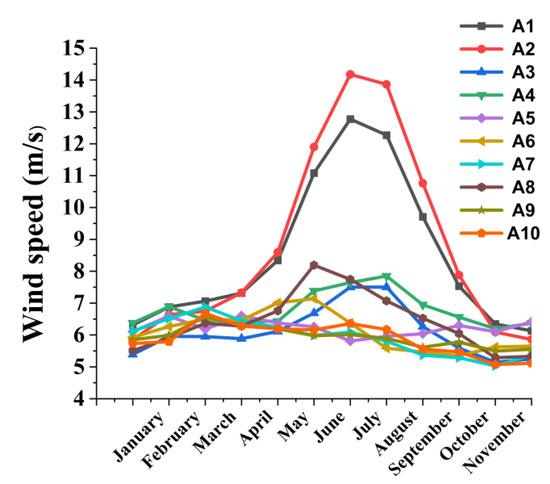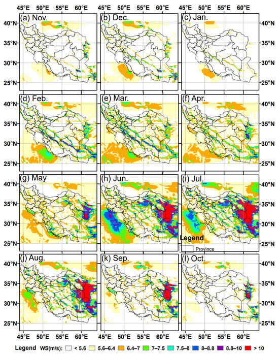 Overall, the total runs of the WRF model generated approximately 280 billion wind records (spatial resolution of 5 km × 5 km) over the Iranian territory, collected at levels near the Earth’s surface, specifically up to a height of 200 m above ground level. To assess the wind energy potential, monthly and seasonal averages of wind speed were analyzed at different heights, particularly at 50 m a.g.l, which is the mean height for wind turbines. The spatial distribution of wind speed over Iran at this height is shown in Figure 5, Figure 6 and Figure 7, on a monthly, seasonal and annual basis, respectively, covering the period 2004–2020.